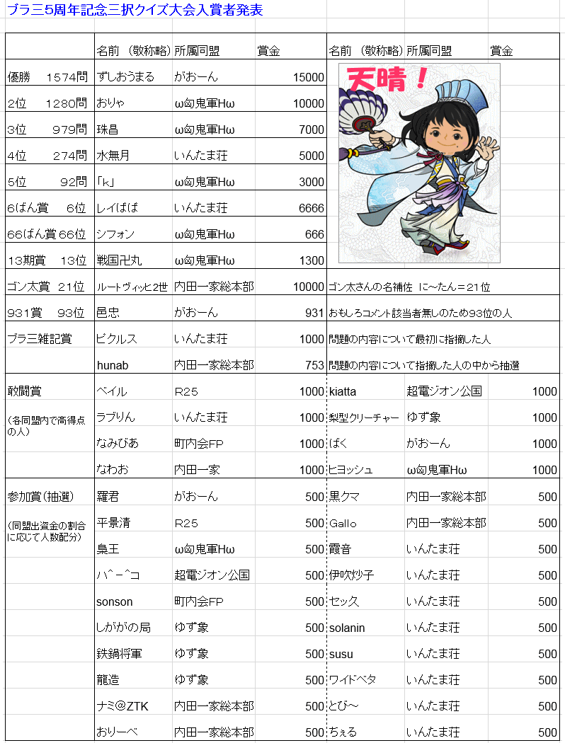 今回は「第三回 同盟対抗ブラ三クイズ選手権」にご参加いただき本当にありがとうございました。いくつか出題(問題入力)ミスや、