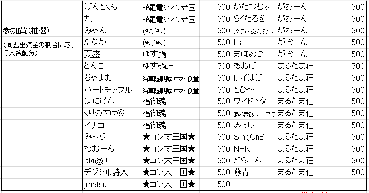 (提供)★ゴン太★様 chichi様 その他、各同盟内でスポンサーになってくださった皆様方 ありがとうございました!!