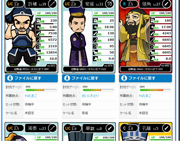 | か:ルールはどうしましょうか。前と同じことの繰り返しで最初から結果が分かってるような対決ではおもしろくないと思うんですよ。もうちょっと弱めにしましょうか。 南:そうだねぇ。 か:今期は馬が7割、弓が3割で、合計1万くらいですね。 南:あの許ちょ売ってしまって騎兵には弱いんだよね。 か:じゃぁ、武将を荀ケにします。題して『かお卵デュエルエースの挑戦』。これでどうでしょう。荀ケは攻撃スキルがついてるんですけど、孔融だったらスキル無しですけど。。。 |