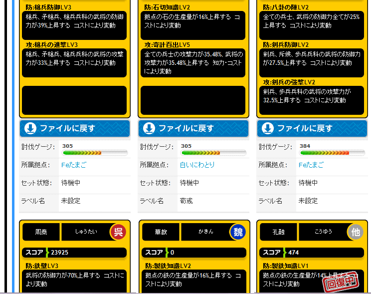 | 南:じゃぁ、こうしよう。5000ずつ2回に分けて出兵してみて。劉備や神医で回復して2回受け止めてみるから。 1回目は孔融で。2回目は荀ケで全力出して来てみて。 か:はい、分かりました。じゃぁそうしましょう。 それとね、南蛮王さんの拠点のすぐそばにある私の拠点に矛槍兵が1500−2000くらいいますから、それ単騎で攻撃していいですよ。 最終日の昼ごろから防御武将セットしておきますから適当にぼこぼこやってもらっていいですよ。出兵があるから籠城は使いません。 南:了解。こっちは籠城使わせてもらうよ。最終日レべリング出兵が終わった後、即帰還で防御武将セットするから、こっちへの攻撃はなるべく終了間際にしてね。 か:分かりました。今見てみたらちょうど仕事の合間の時間に当たるので合わせられそうです。 |